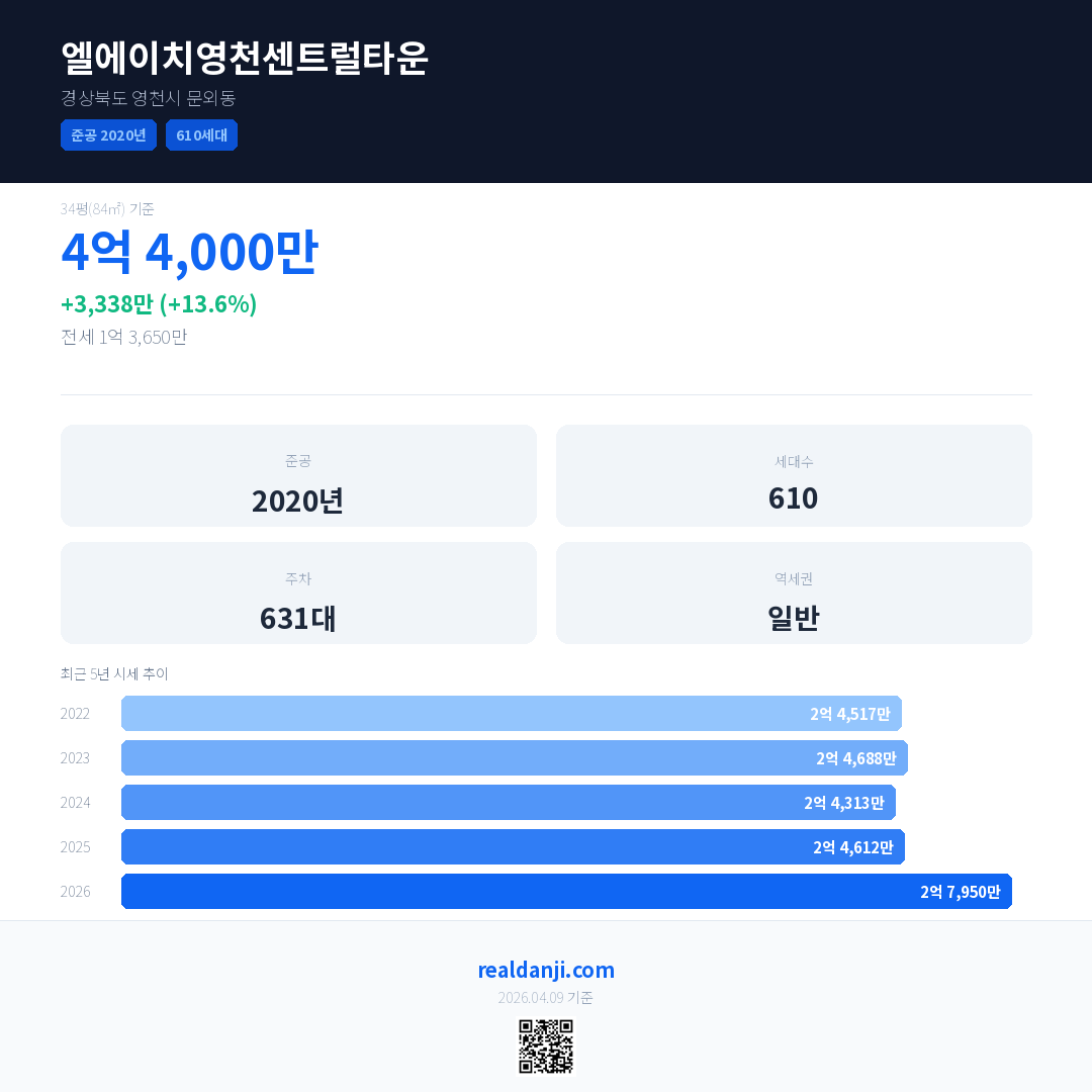 엘에이치영천센트럴타운 국민평형 기준 2026년 평균 거래가는 2억 7,950만으로, 전년 대비 13.6% 상승 했습니다.
