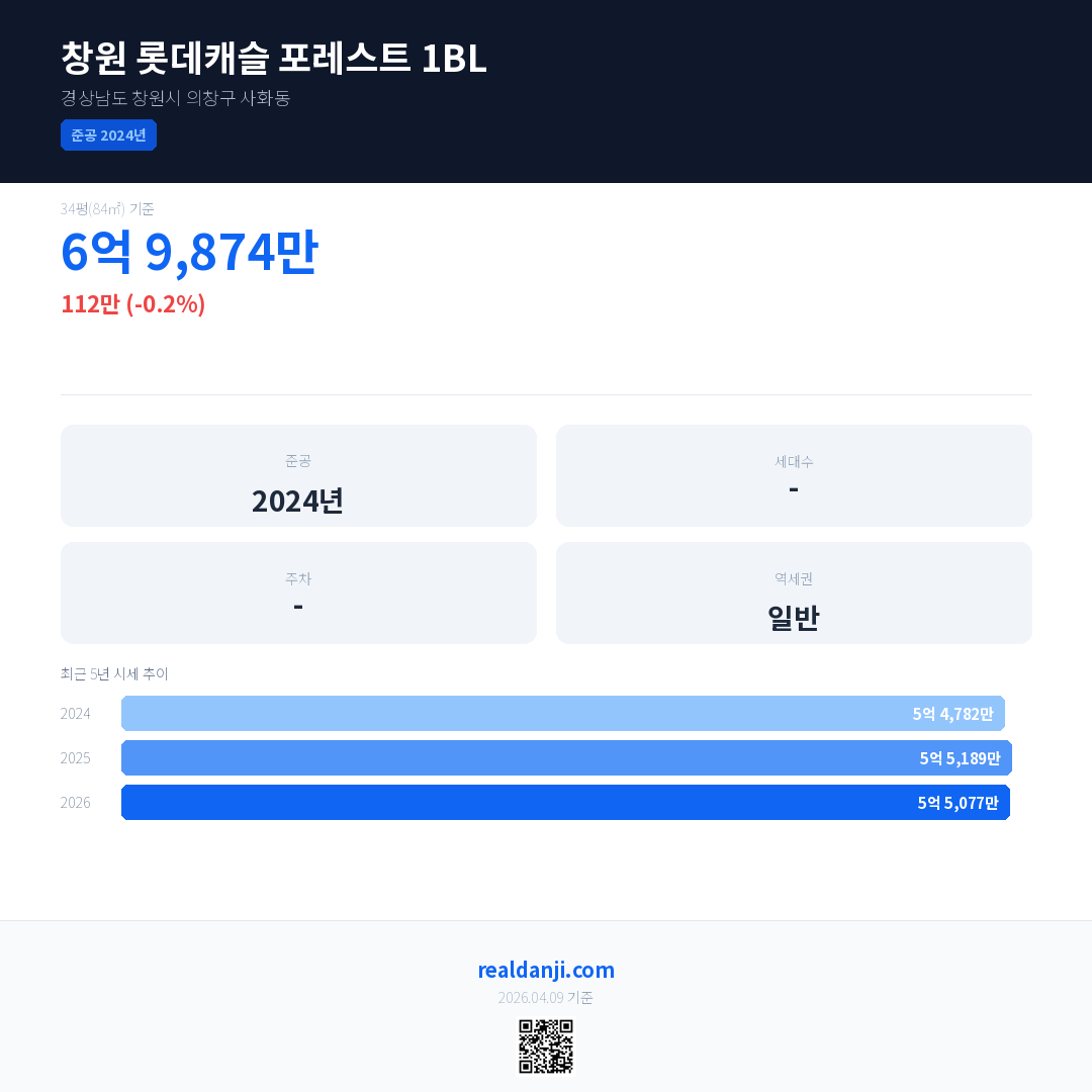 창원 롯데캐슬 포레스트 1BL 최근 거래가는 5억 2,449만입니다. (2026-04)