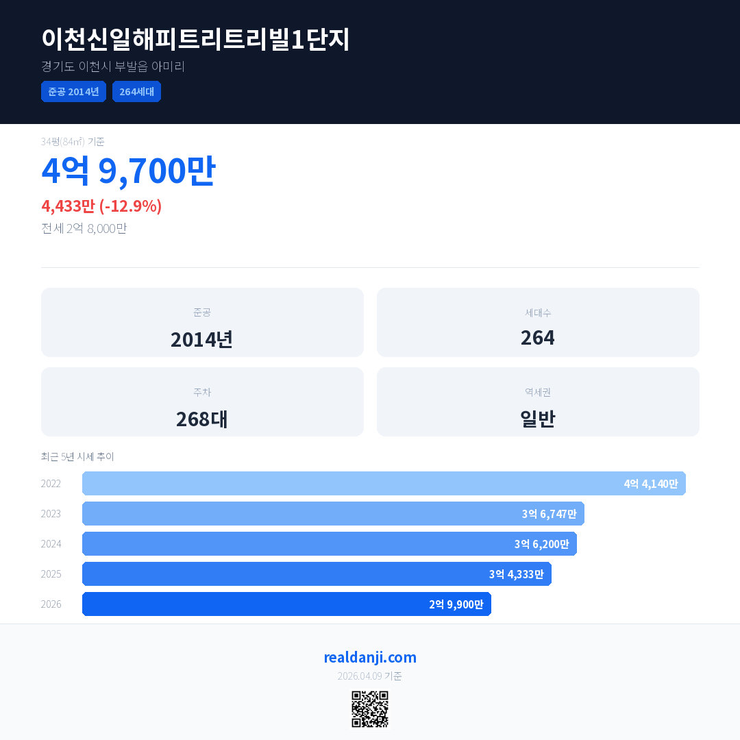 이천신일해피트리트리빌1단지 국민평형 기준 2026년 평균 거래가는 2억 9,900만으로, 전년 대비 12.9% 하락 했습니다.