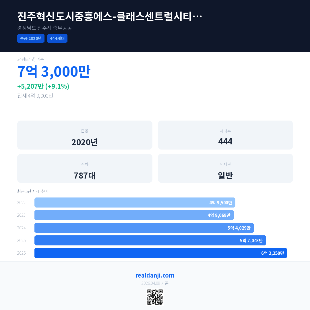 진주혁신도시중흥에스-클래스센트럴시티4단지 국민평형 기준 2026년 평균 거래가는 6억 2,250만으로, 전년 대비 9.1% 상승 했습니다.