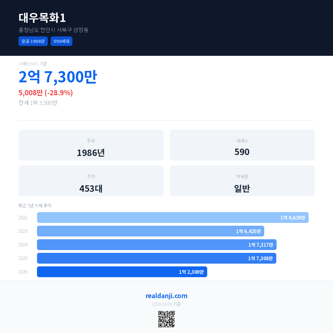 대우목화1 최근 거래가는 2억 7,300만입니다. (2026-03)