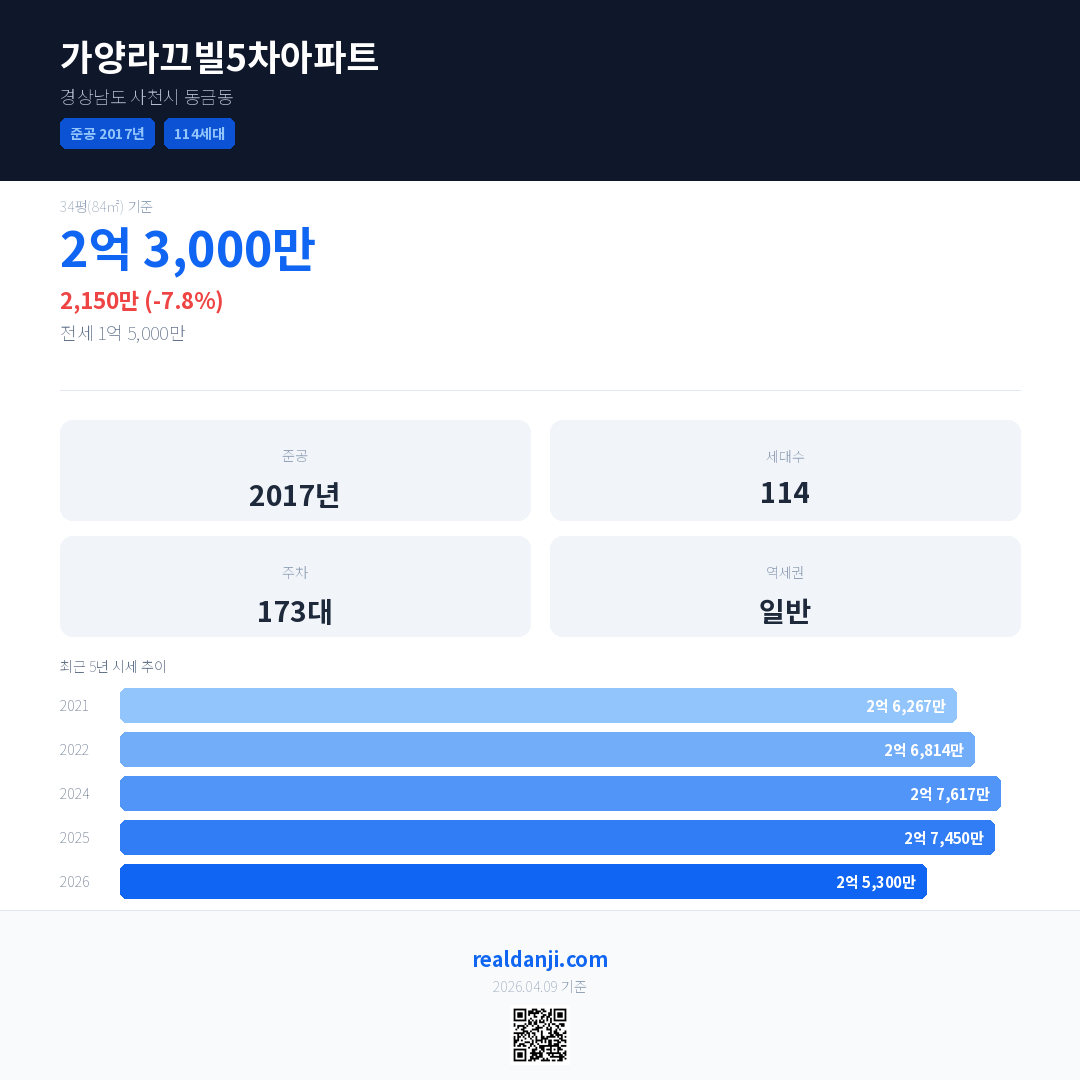 가양라끄빌5차아파트 국민평형 기준 2026년 평균 거래가는 2억 5,300만으로, 전년 대비 7.8% 하락 했습니다.