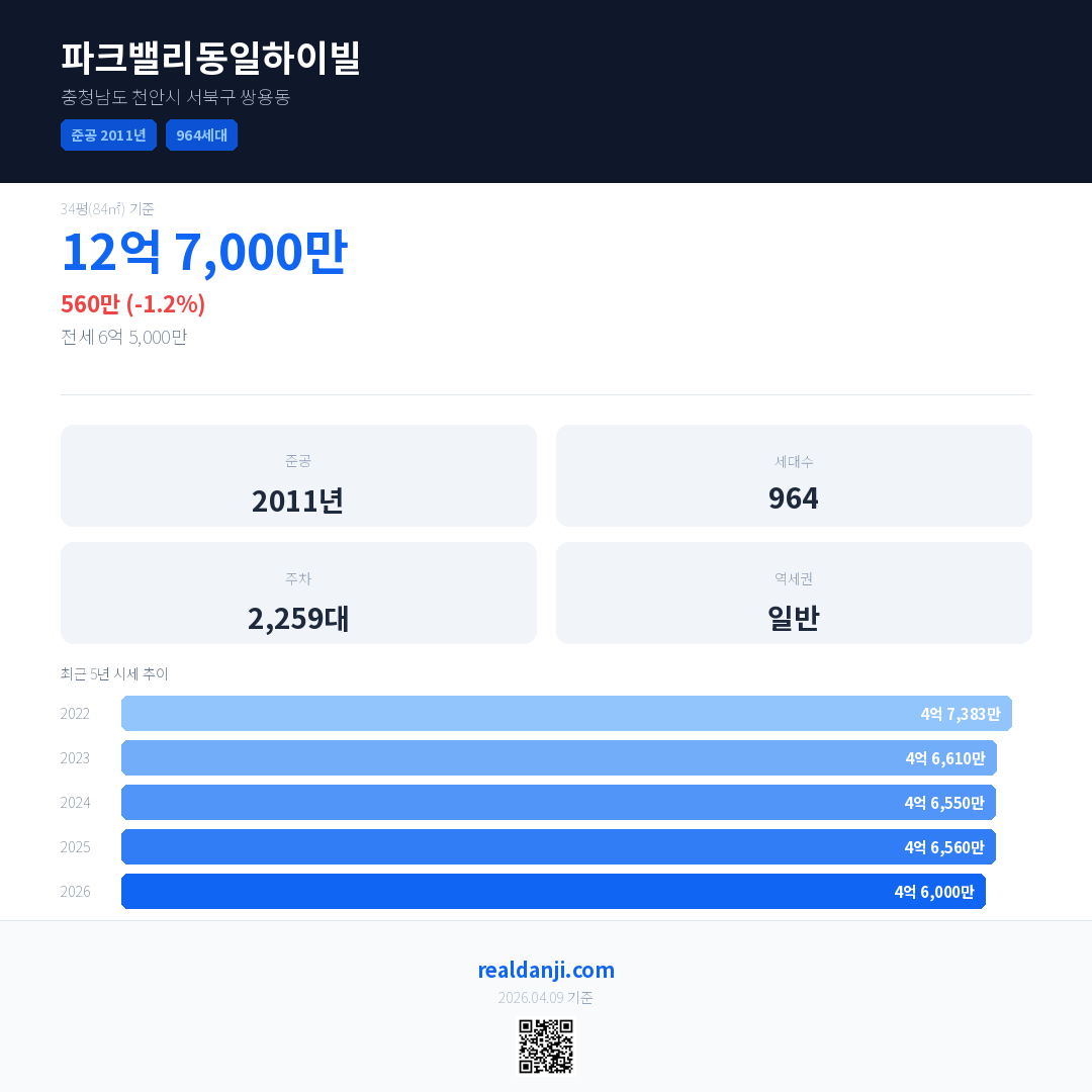 파크밸리동일하이빌 국민평형 기준 2026년 평균 거래가는 4억 6,000만으로, 전년 대비 1.2% 하락 했습니다.