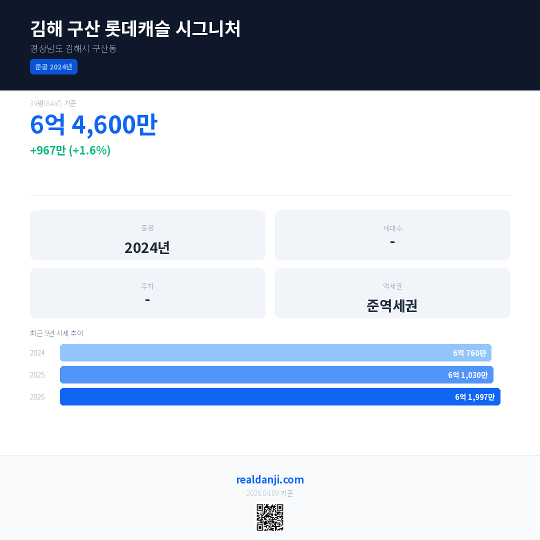 김해 구산 롯데캐슬 시그니처 국민평형 기준 2026년 평균 거래가는 6억 1,997만으로, 전년 대비 1.6% 상승 했습니다.