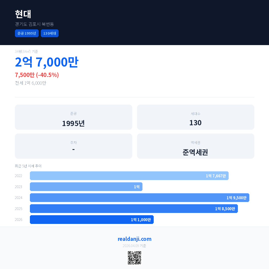현대 국민평형 기준 2026년 평균 거래가는 1억 1,000만으로, 전년 대비 40.5% 하락 했습니다.