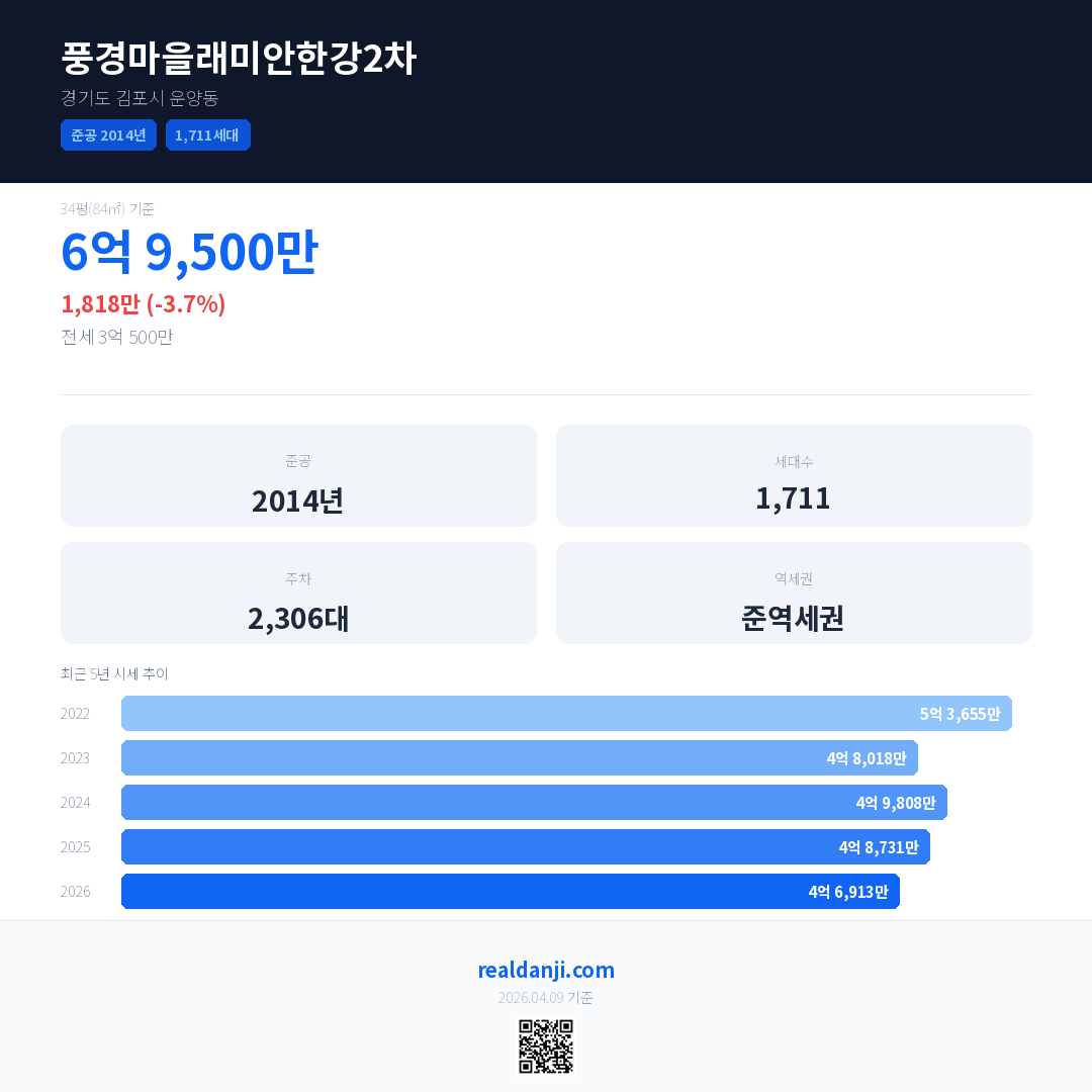 풍경마을래미안한강2차 국민평형 기준 2026년 평균 거래가는 4억 6,913만으로, 전년 대비 3.7% 하락 했습니다.