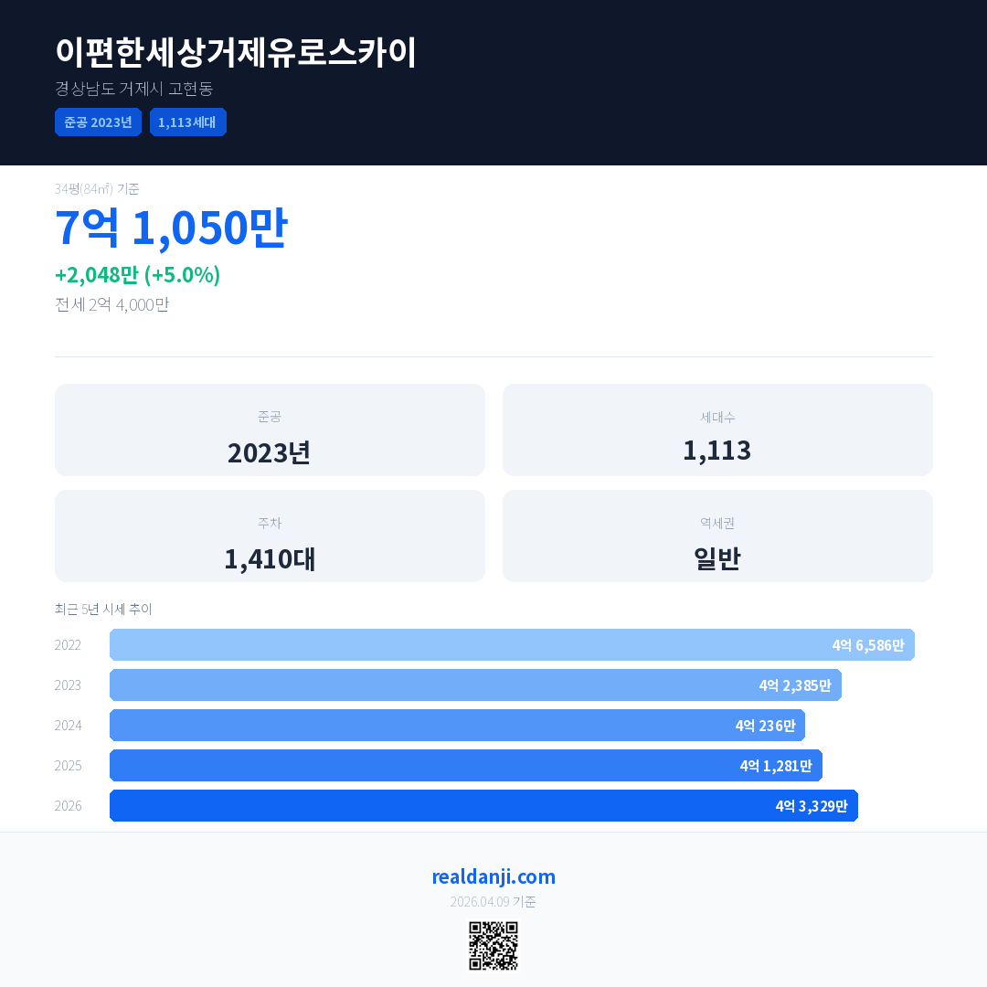 이편한세상거제유로스카이 국민평형 기준 2026년 평균 거래가는 4억 3,329만으로, 전년 대비 5.0% 상승 했습니다.