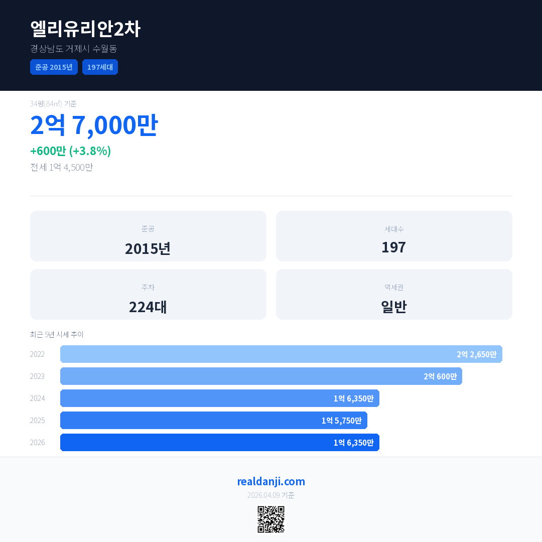 엘리유리안2차 국민평형 기준 2026년 평균 거래가는 1억 6,350만으로, 전년 대비 3.8% 상승 했습니다.