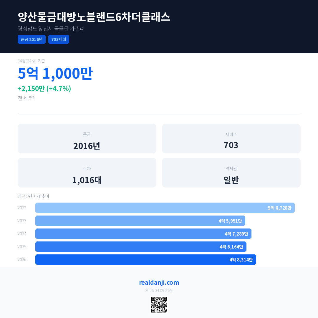 양산물금대방노블랜드6차더클래스은(는) 2016년에 준공되었으며, 현재 10년차입니다. 총 703세대 규모입니다.
