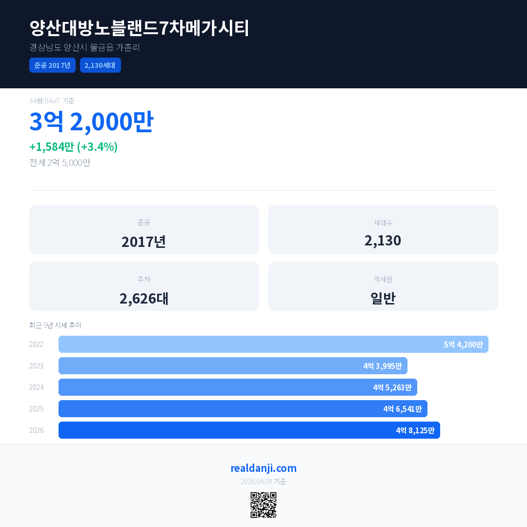 양산대방노블랜드7차메가시티 국민평형 기준 2026년 평균 거래가는 4억 8,125만으로, 전년 대비 3.4% 상승 했습니다.