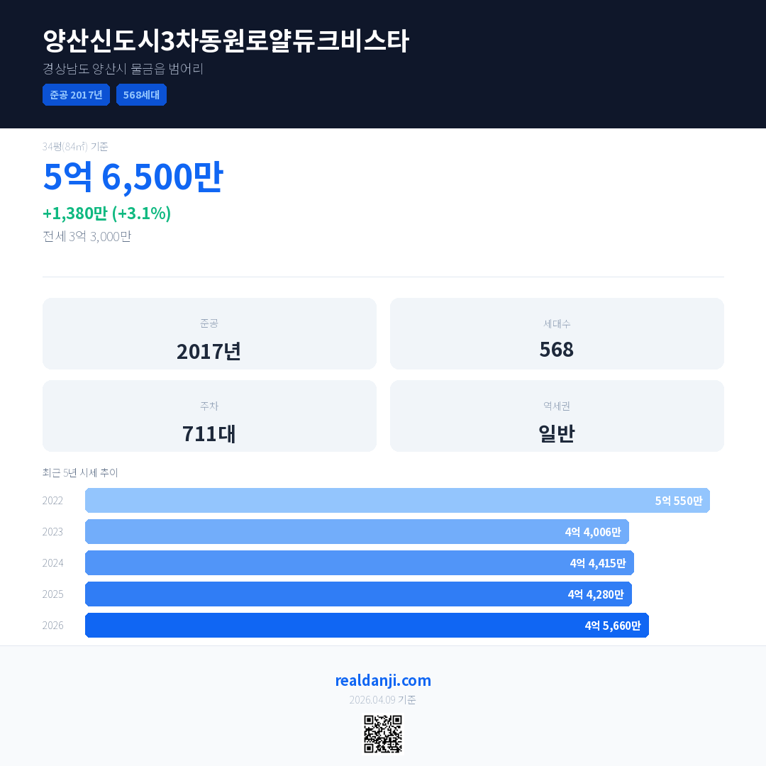 양산신도시3차동원로얄듀크비스타 국민평형 기준 2026년 평균 거래가는 4억 5,660만으로, 전년 대비 3.1% 상승 했습니다.
