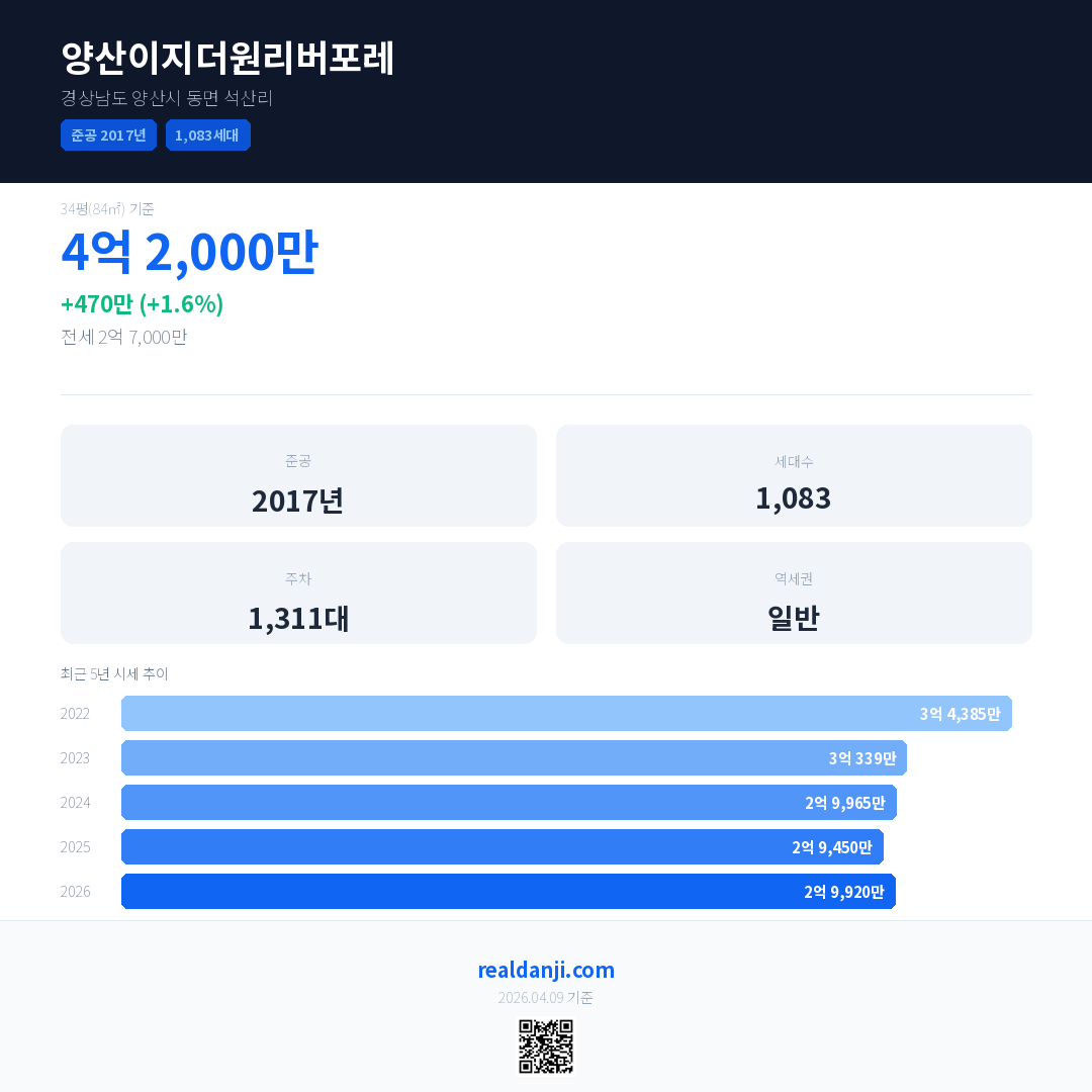 양산이지더원리버포레 국민평형 기준 2026년 평균 거래가는 2억 9,920만으로, 전년 대비 1.6% 상승 했습니다.