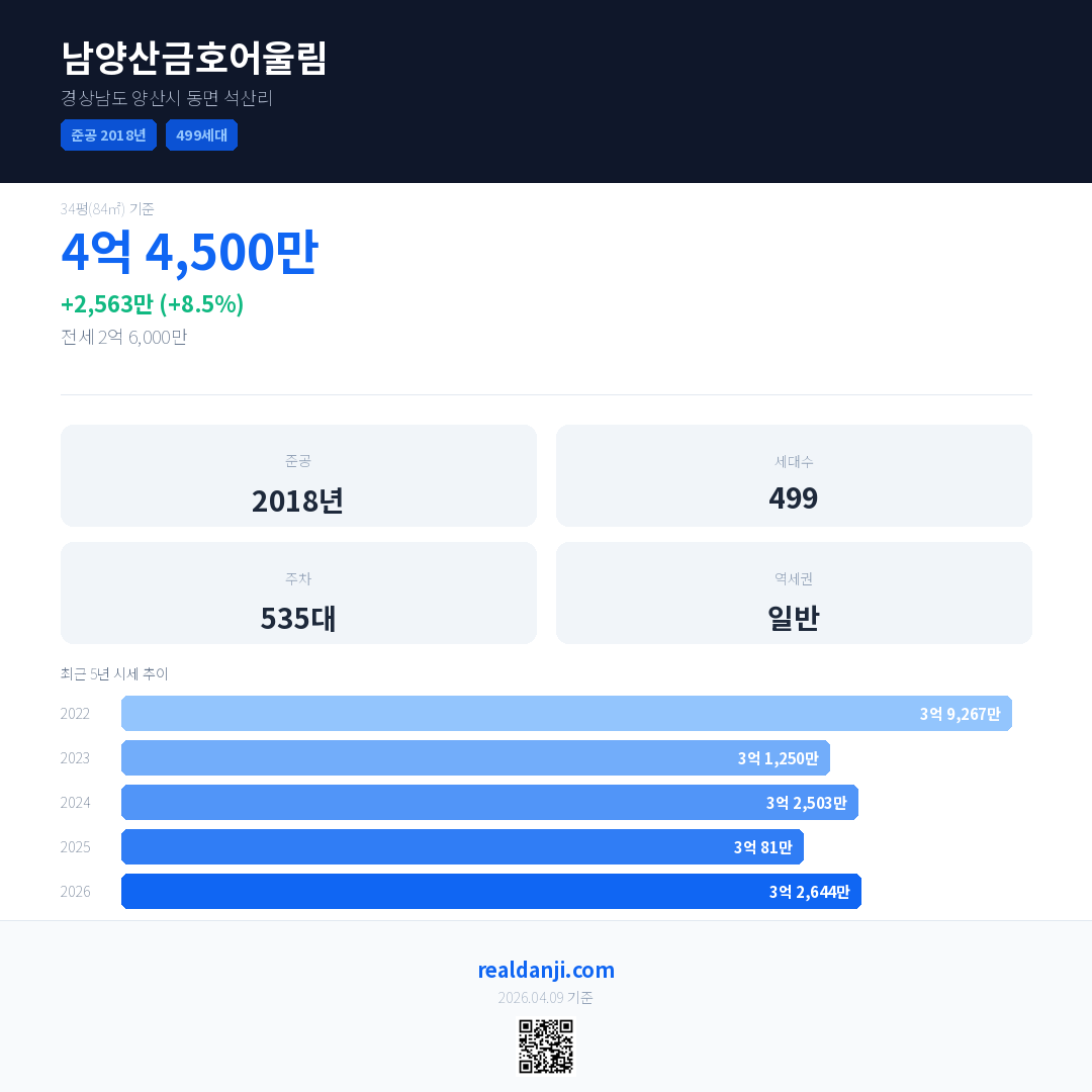 남양산금호어울림 최근 거래가는 4억 4,500만입니다. (2026-03)