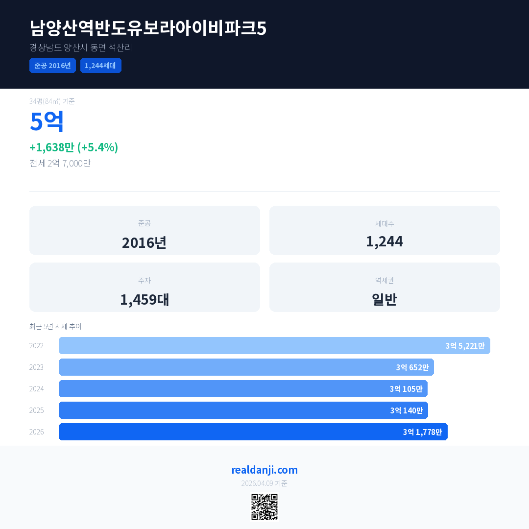 남양산역반도유보라아이비파크5 최근 거래가는 5억입니다. (2026-04)