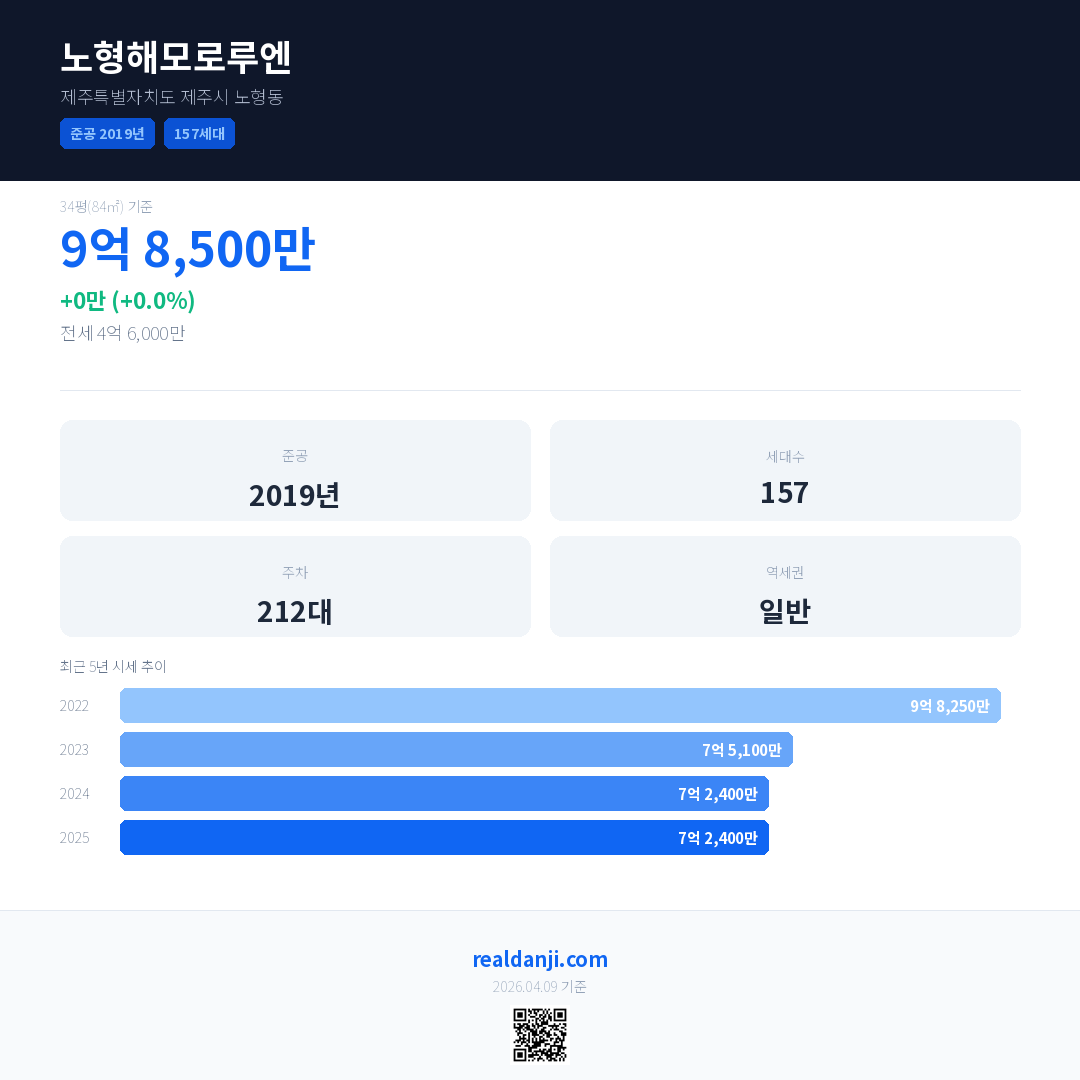 노형해모로루엔 국민평형 기준 2025년 평균 거래가는 7억 2,400만으로, 전년 대비 0.0% 하락 했습니다.