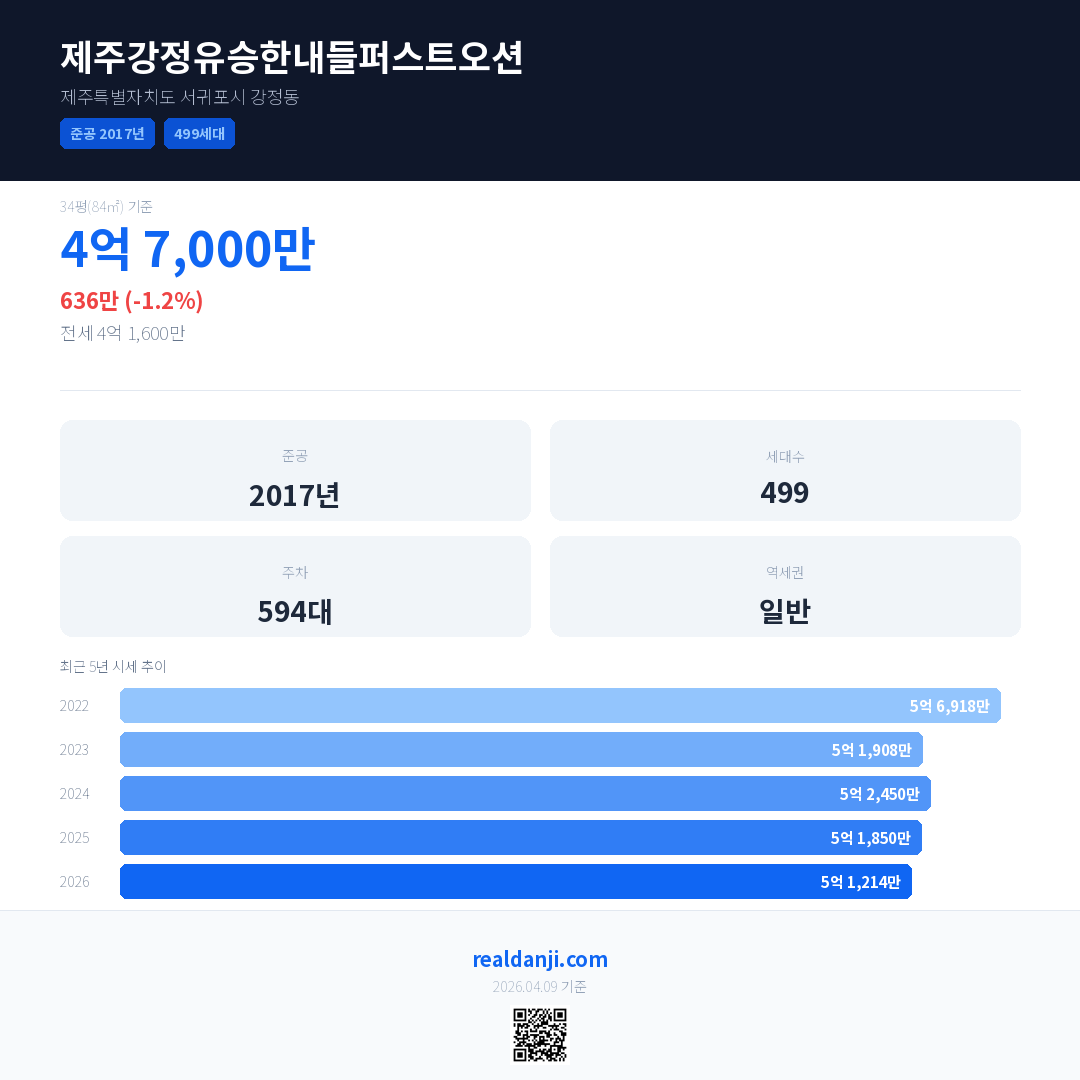 제주강정유승한내들퍼스트오션 최근 거래가는 4억 7,000만입니다. (2026-04)