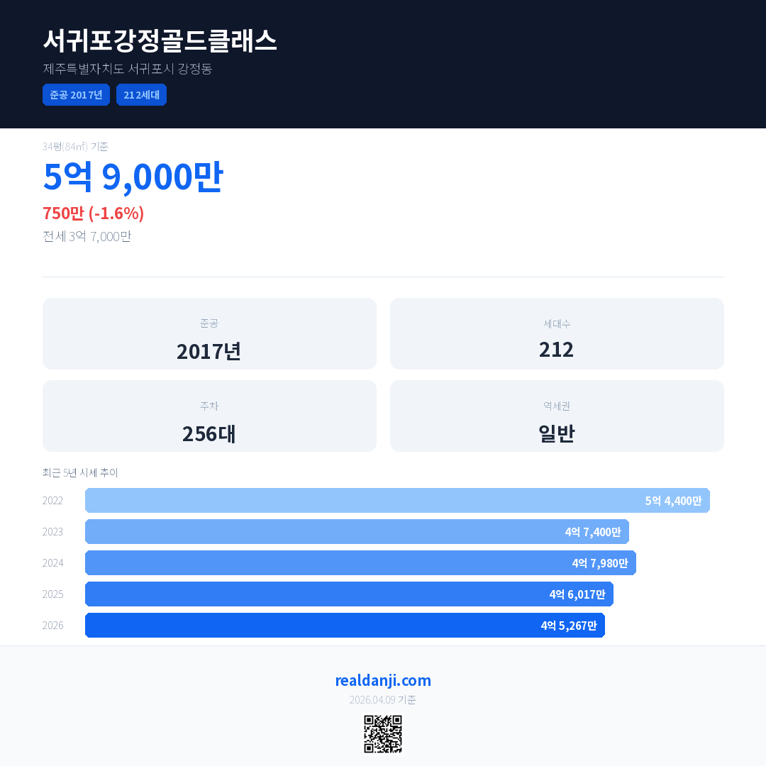 서귀포강정골드클래스 국민평형 기준 2026년 평균 거래가는 4억 5,267만으로, 전년 대비 1.6% 하락 했습니다.