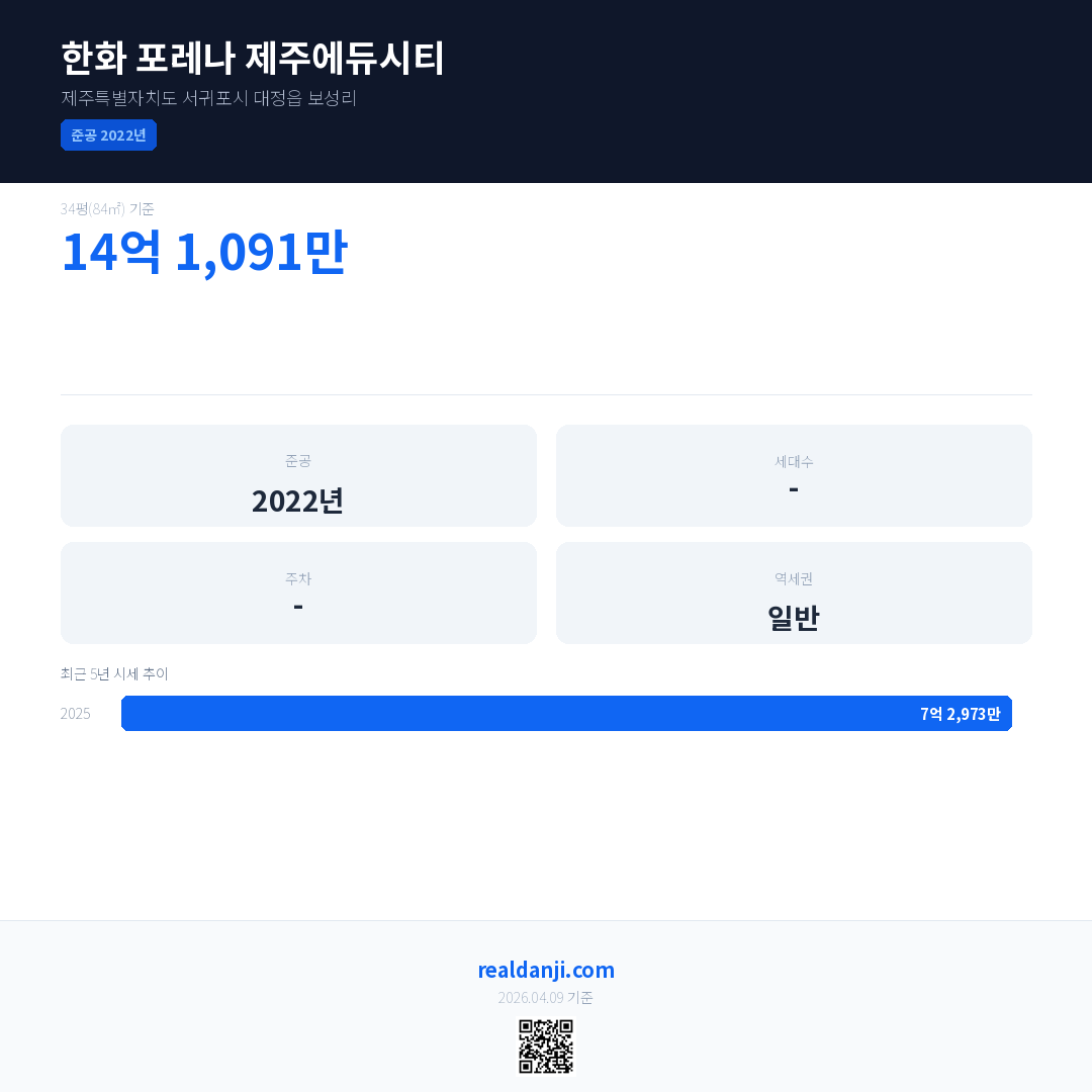 한화 포레나 제주에듀시티 최근 거래가는 9억 2,860만입니다. (2026-02)