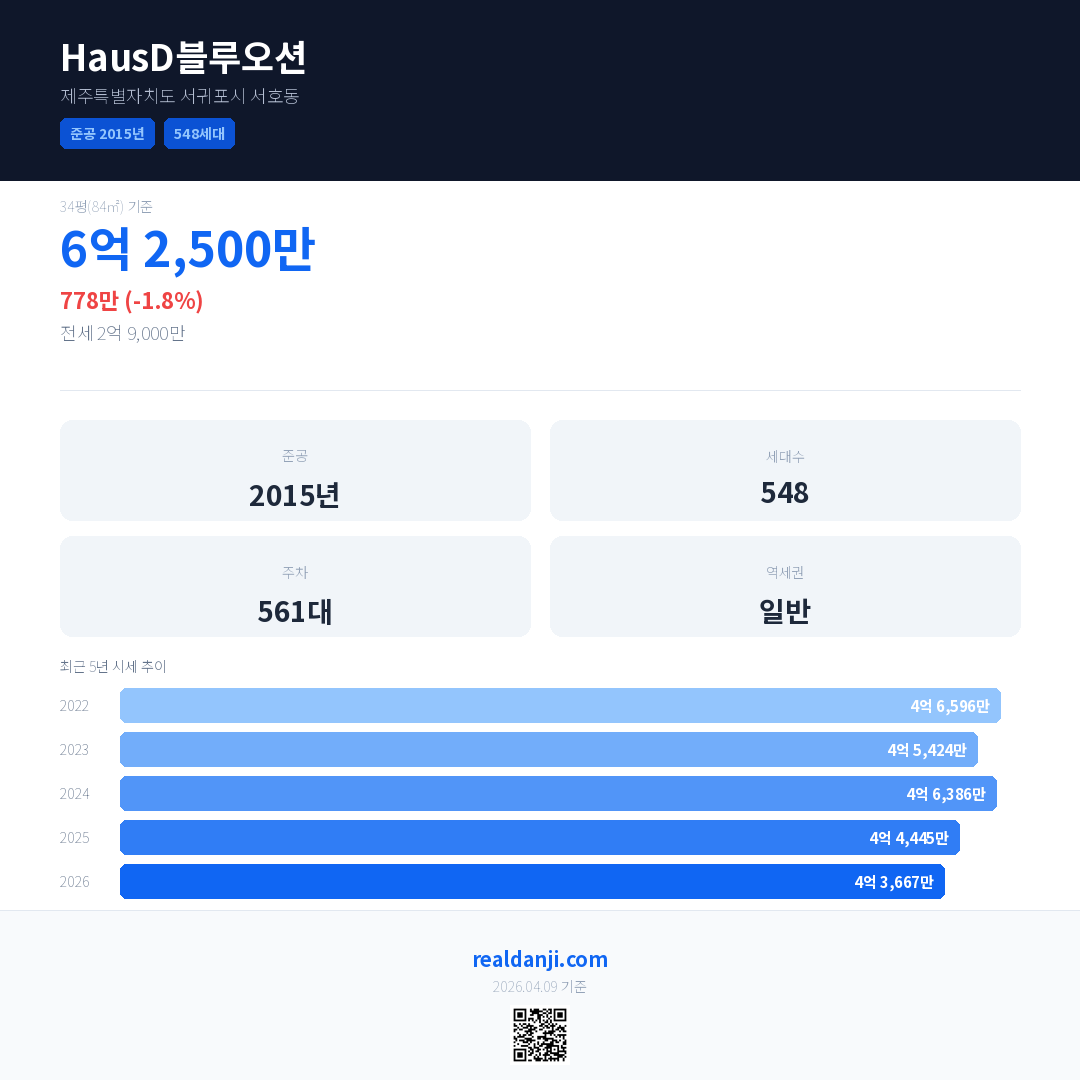 HausD블루오션 최근 거래가는 6억 2,500만입니다. (2026-03)