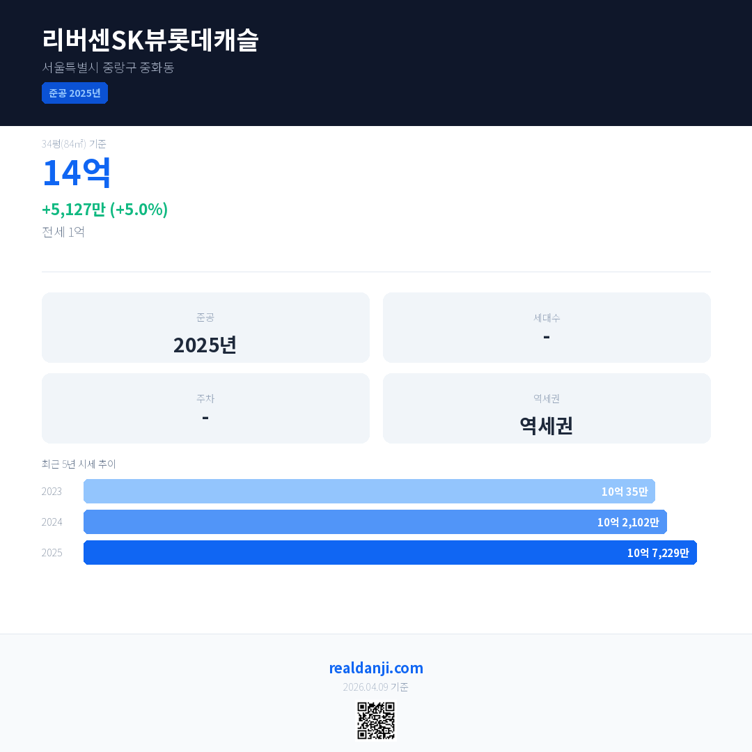 리버센SK뷰롯데캐슬 국민평형 기준 2025년 평균 거래가는 10억 7,229만으로, 전년 대비 5.0% 상승 했습니다.