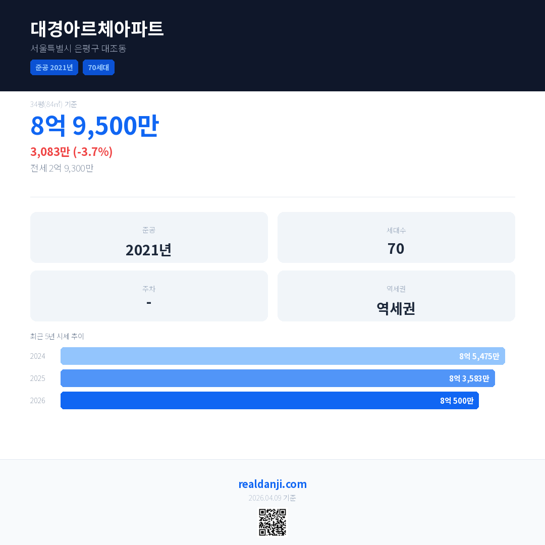 대경아르체아파트 국민평형 기준 2026년 평균 거래가는 8억 500만으로, 전년 대비 3.7% 하락 했습니다.