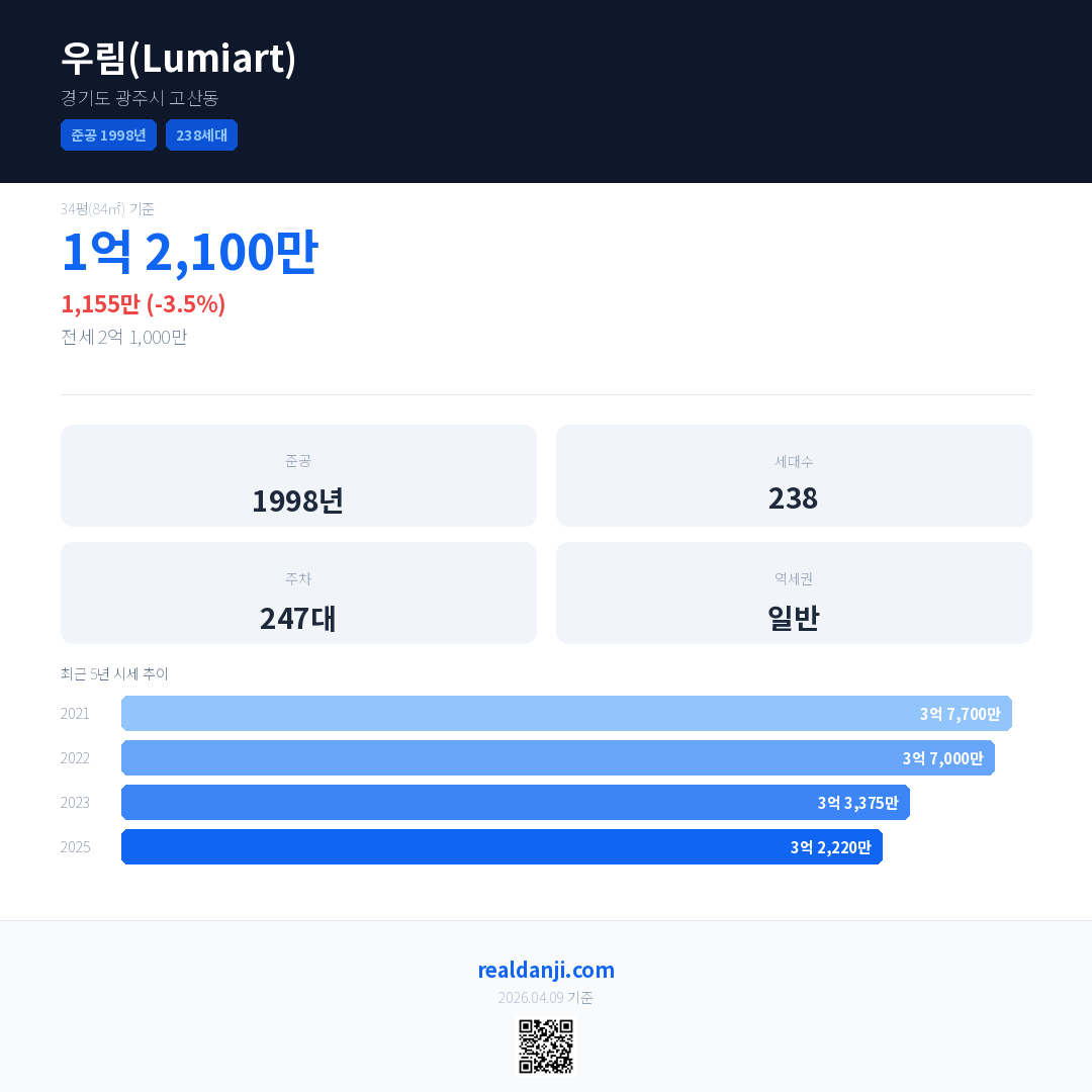 우림(Lumiart) 국민평형 기준 2025년 평균 거래가는 3억 2,220만으로, 전년 대비 3.5% 하락 했습니다.