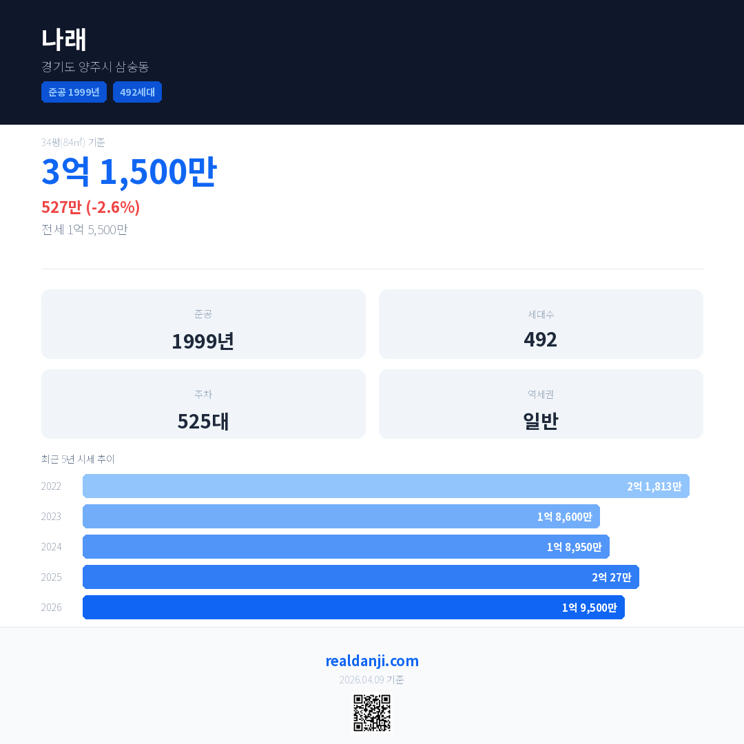 나래 국민평형 기준 2026년 평균 거래가는 1억 9,500만으로, 전년 대비 2.6% 하락 했습니다.