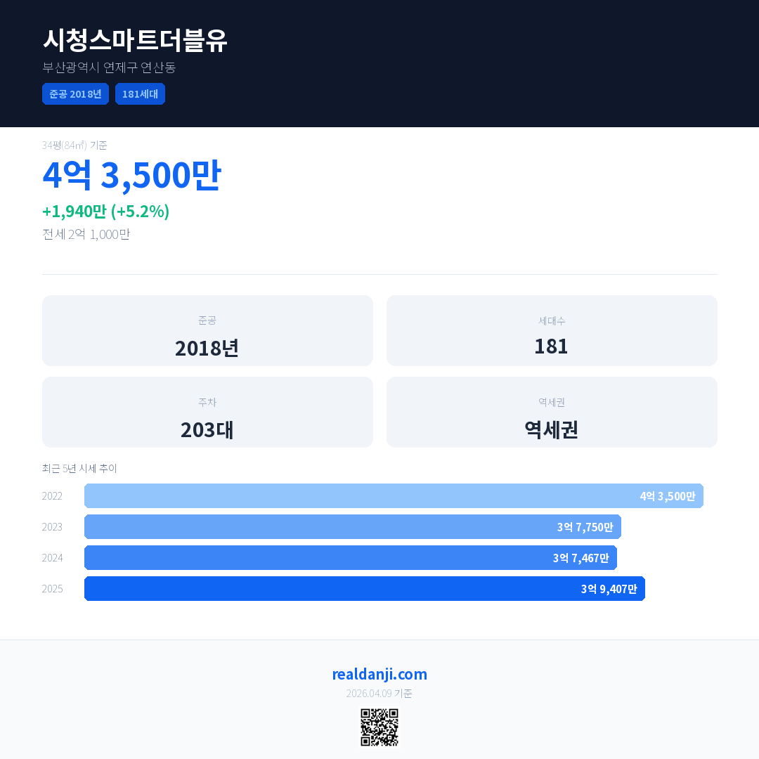 시청스마트더블유 국민평형 기준 2025년 평균 거래가는 3억 9,407만으로, 전년 대비 5.2% 상승 했습니다.