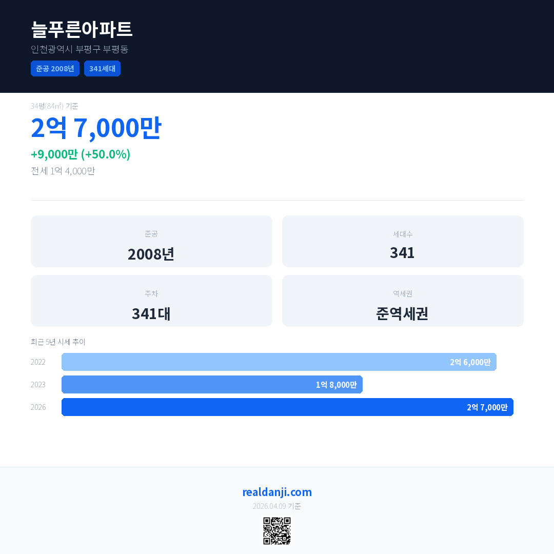 늘푸른아파트 국민평형 기준 2026년 평균 거래가는 2억 7,000만으로, 전년 대비 50.0% 상승 했습니다.