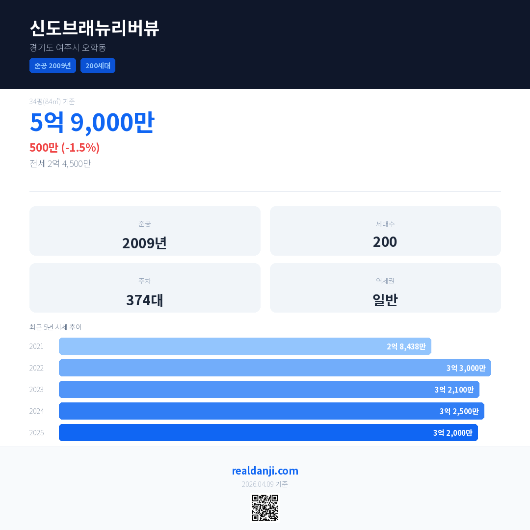 신도브래뉴리버뷰은(는) 2009년에 준공되었으며, 현재 17년차입니다. 총 200세대 규모입니다.