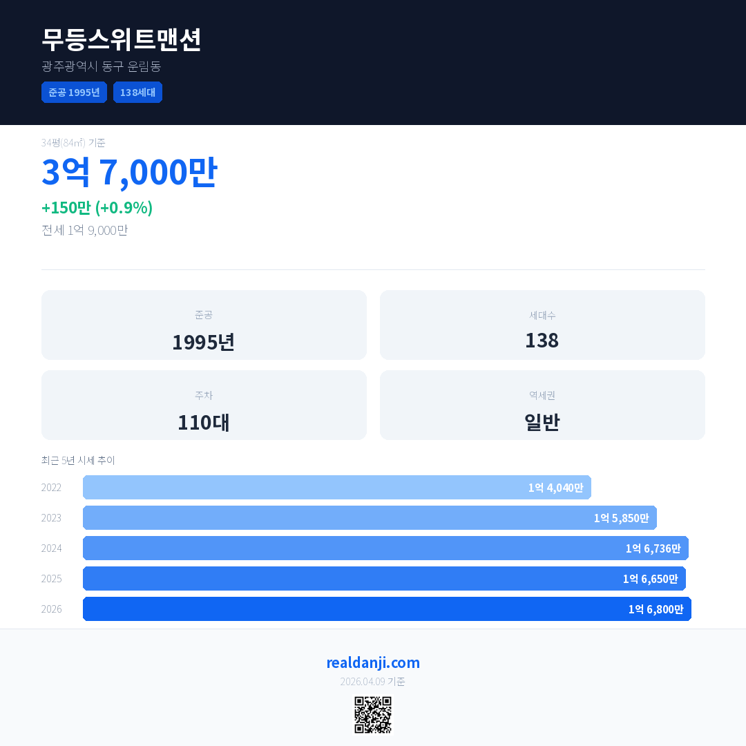 무등스위트맨션 최근 거래가는 3억 7,000만입니다. (2026-03)