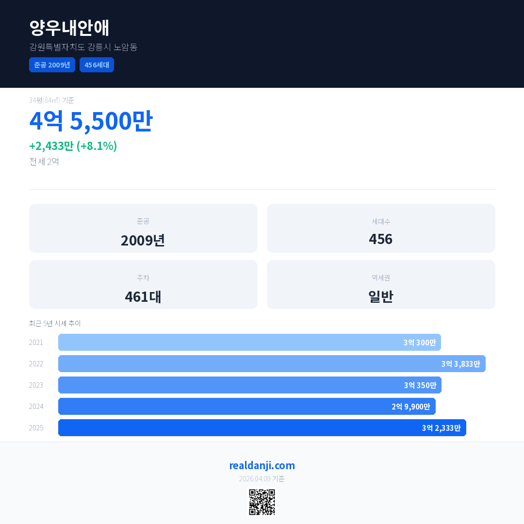 양우내안애은(는) 2009년에 준공되었으며, 현재 17년차입니다. 총 456세대 규모입니다.