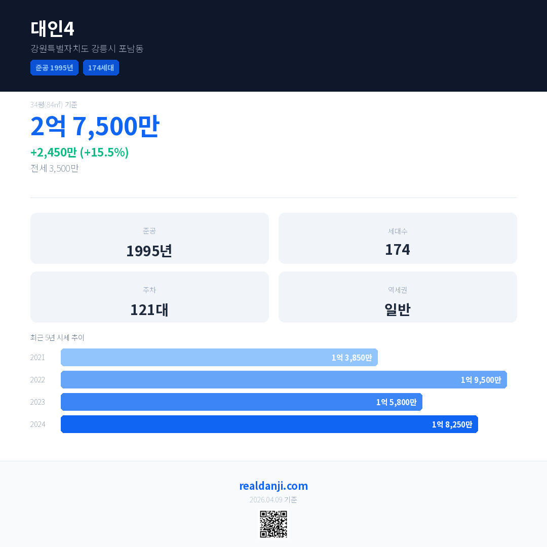 대인4 국민평형 기준 2024년 평균 거래가는 1억 8,250만으로, 전년 대비 15.5% 상승 했습니다.