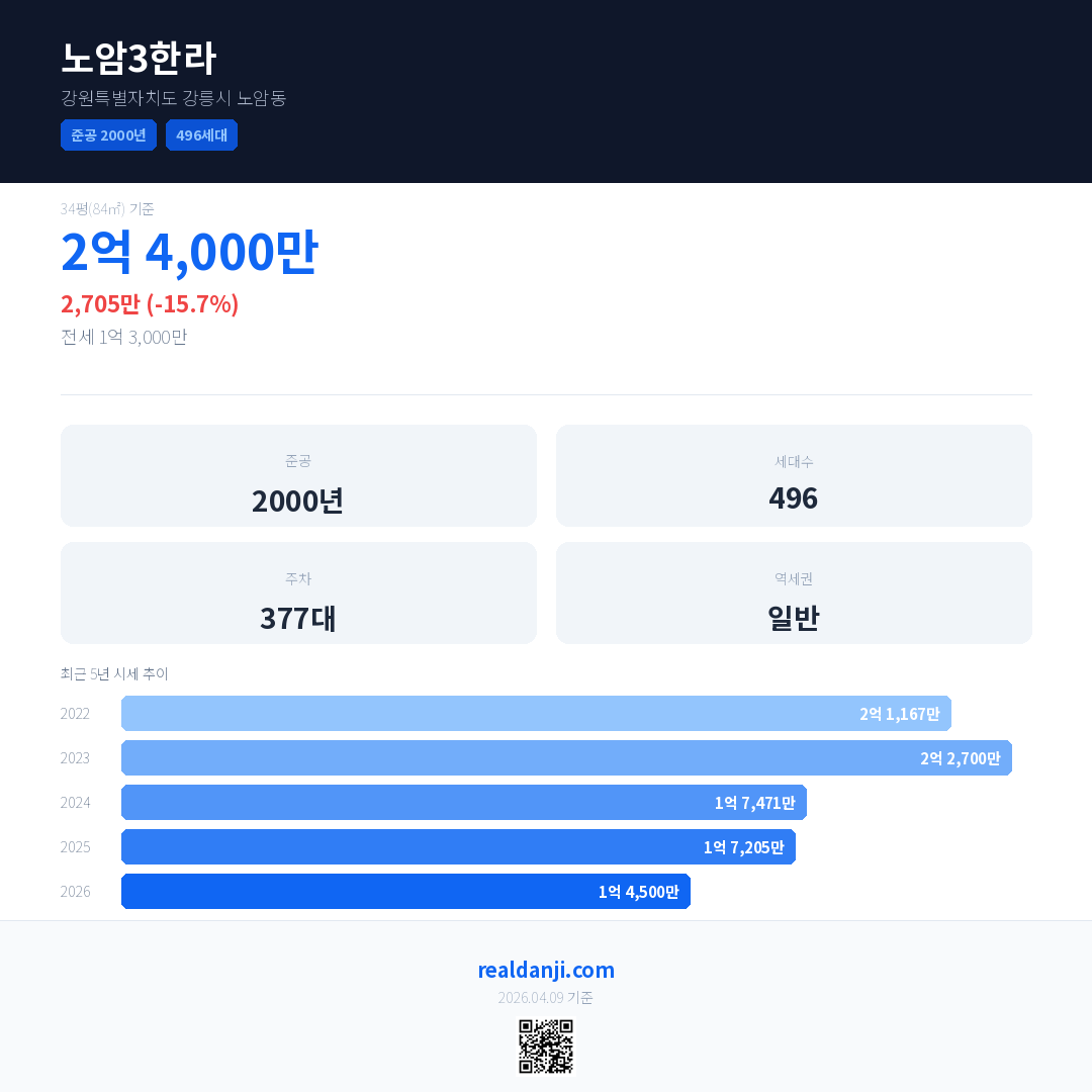 노암3한라은(는) 2000년에 준공되었으며, 현재 26년차입니다. 총 496세대 규모입니다.