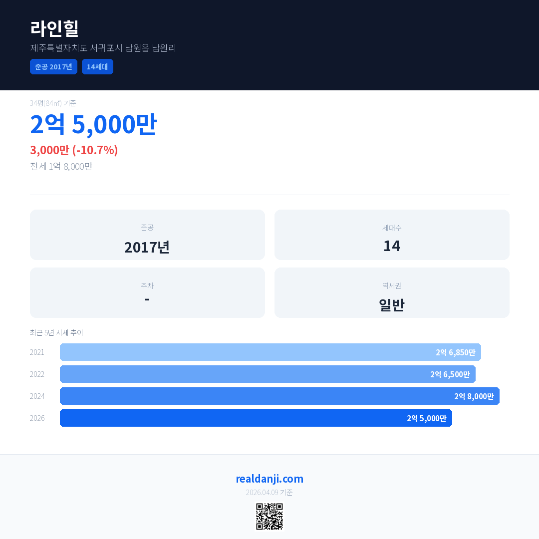 라인힐 국민평형 기준 2026년 평균 거래가는 2억 5,000만으로, 전년 대비 10.7% 하락 했습니다.