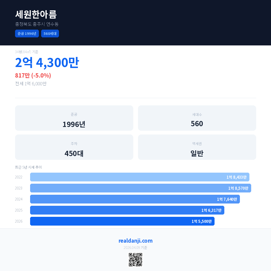 세원한아름 국민평형 기준 2026년 평균 거래가는 1억 5,500만으로, 전년 대비 5.0% 하락 했습니다.