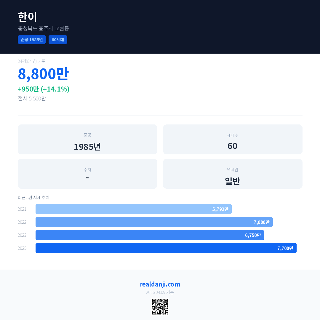 한이 국민평형 기준 2025년 평균 거래가는 7,700만으로, 전년 대비 14.1% 상승 했습니다.