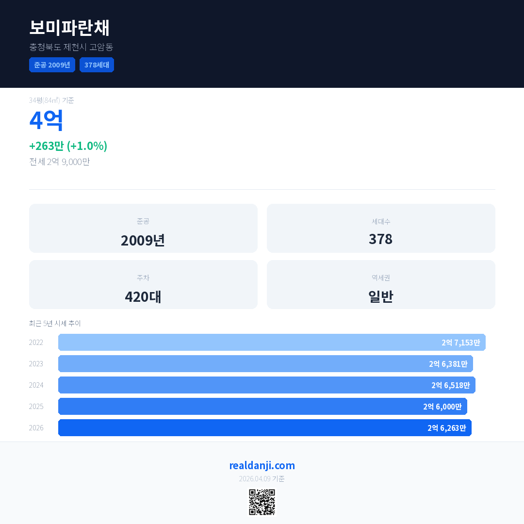 보미파란채 국민평형 기준 2026년 평균 거래가는 2억 6,263만으로, 전년 대비 1.0% 상승 했습니다.