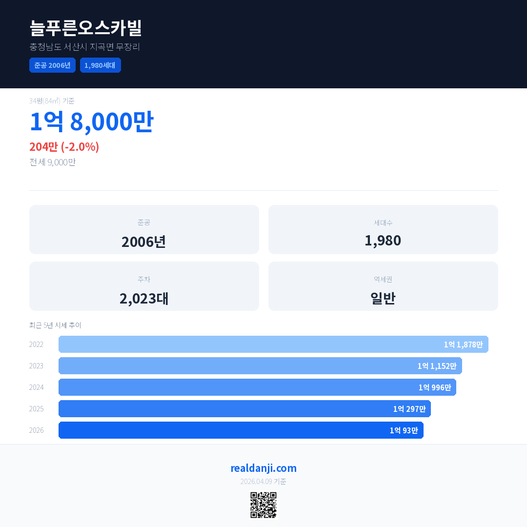 늘푸른오스카빌 국민평형 기준 2026년 평균 거래가는 1억 93만으로, 전년 대비 2.0% 하락 했습니다.