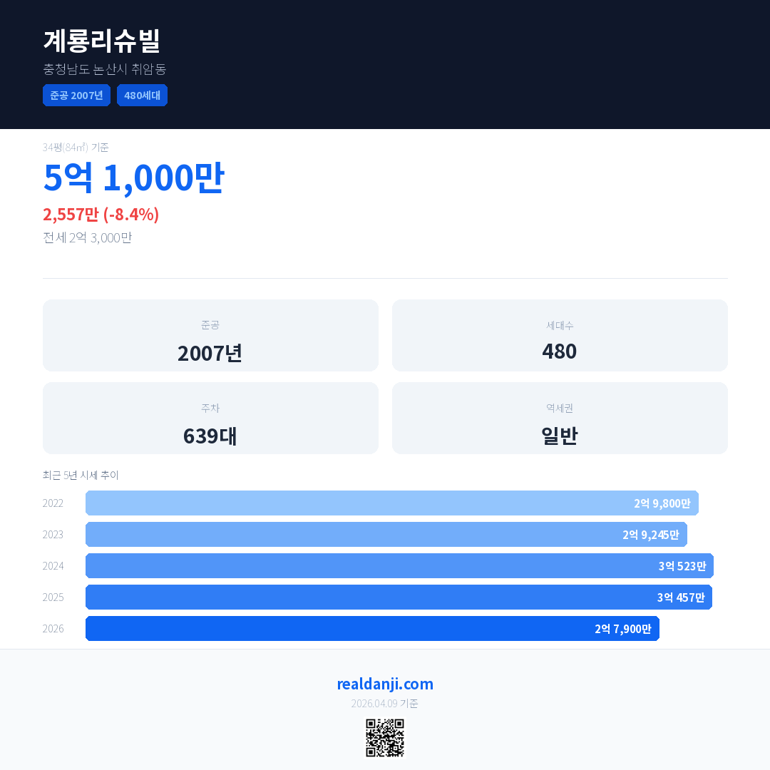 계룡리슈빌 국민평형 기준 2026년 평균 거래가는 2억 7,900만으로, 전년 대비 8.4% 하락 했습니다.