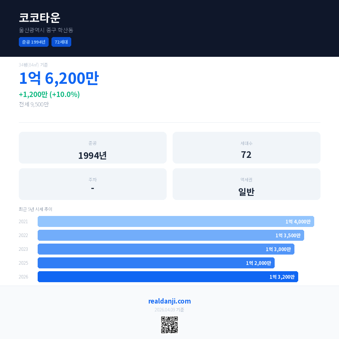 코코타운 국민평형 기준 2026년 평균 거래가는 1억 3,200만으로, 전년 대비 10.0% 상승 했습니다.