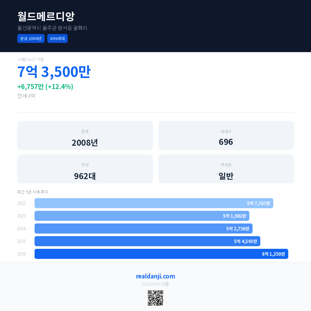 월드메르디앙 국민평형 기준 2026년 평균 거래가는 6억 1,350만으로, 전년 대비 12.4% 상승 했습니다.