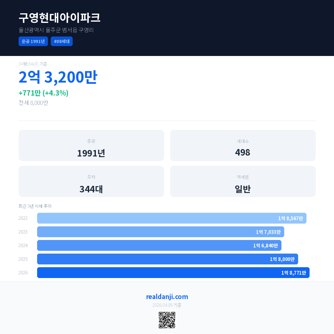 구영현대아이파크 국민평형 기준 2026년 평균 거래가는 1억 8,771만으로, 전년 대비 4.3% 상승 했습니다.