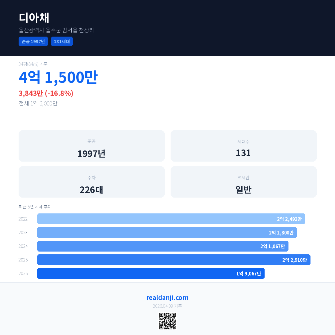 디아채 국민평형 기준 2026년 평균 거래가는 1억 9,067만으로, 전년 대비 16.8% 하락 했습니다.