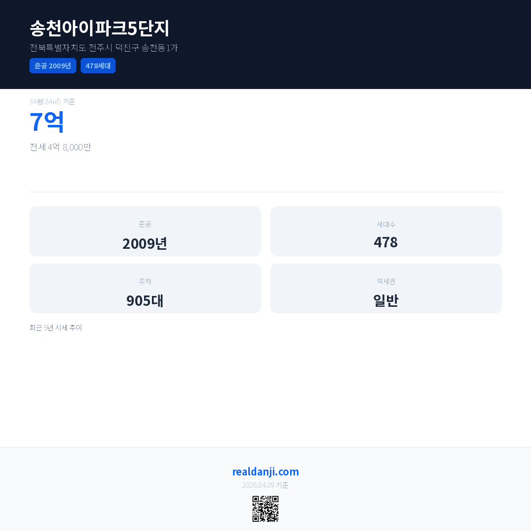 송천아이파크5단지 최근 거래가는 7억입니다. (2026-03)