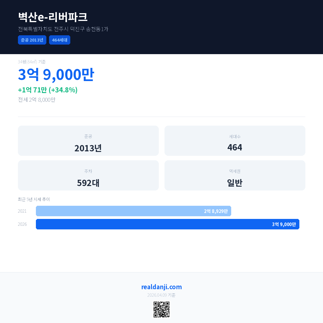 벽산e-리버파크 국민평형 기준 2026년 평균 거래가는 3억 9,000만으로, 전년 대비 34.8% 상승 했습니다.