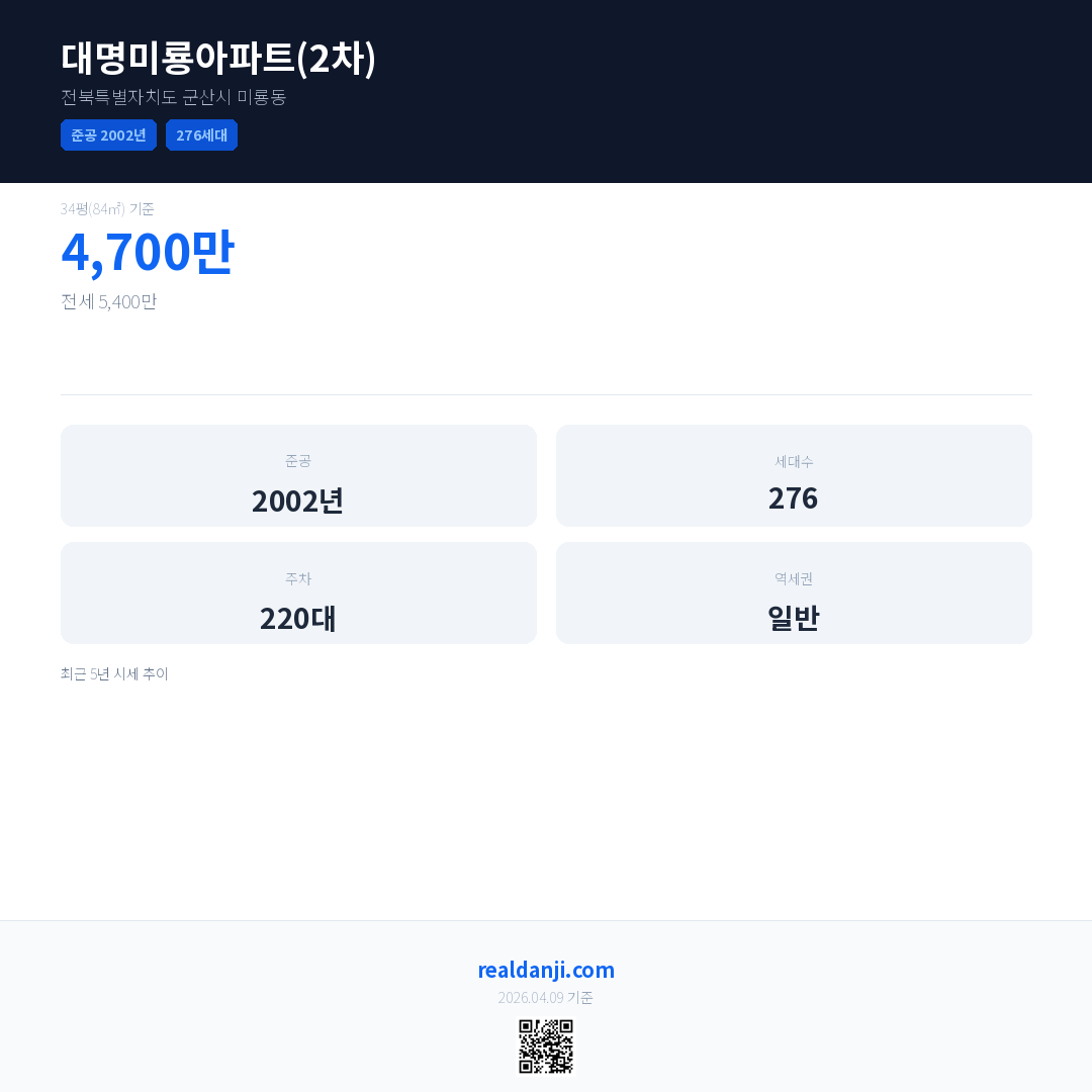 대명미룡아파트(2차)은(는) 2002년에 준공되었으며, 현재 24년차입니다. 총 276세대 규모입니다.