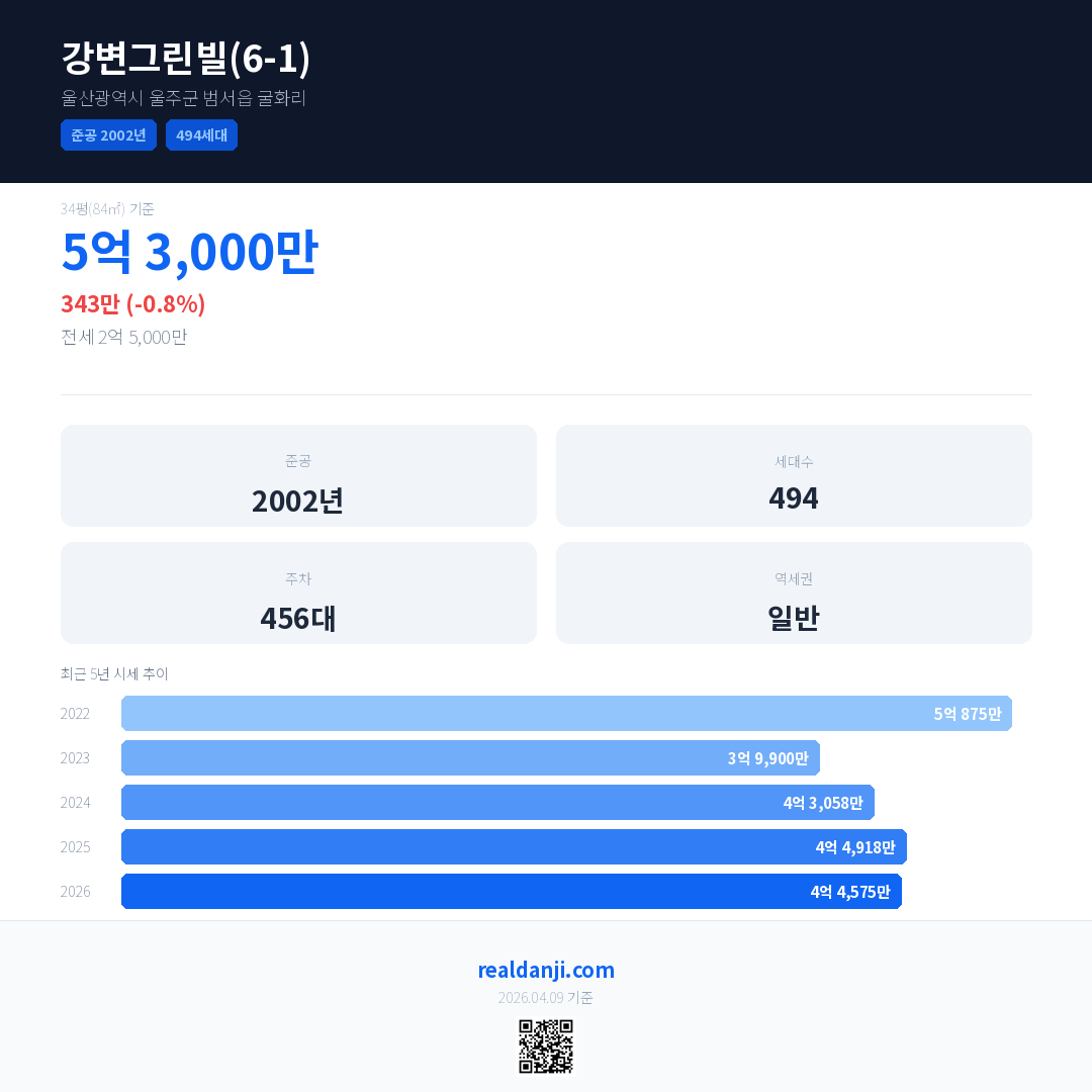강변그린빌(6-1) 국민평형 기준 2026년 평균 거래가는 4억 4,575만으로, 전년 대비 0.8% 하락 했습니다.