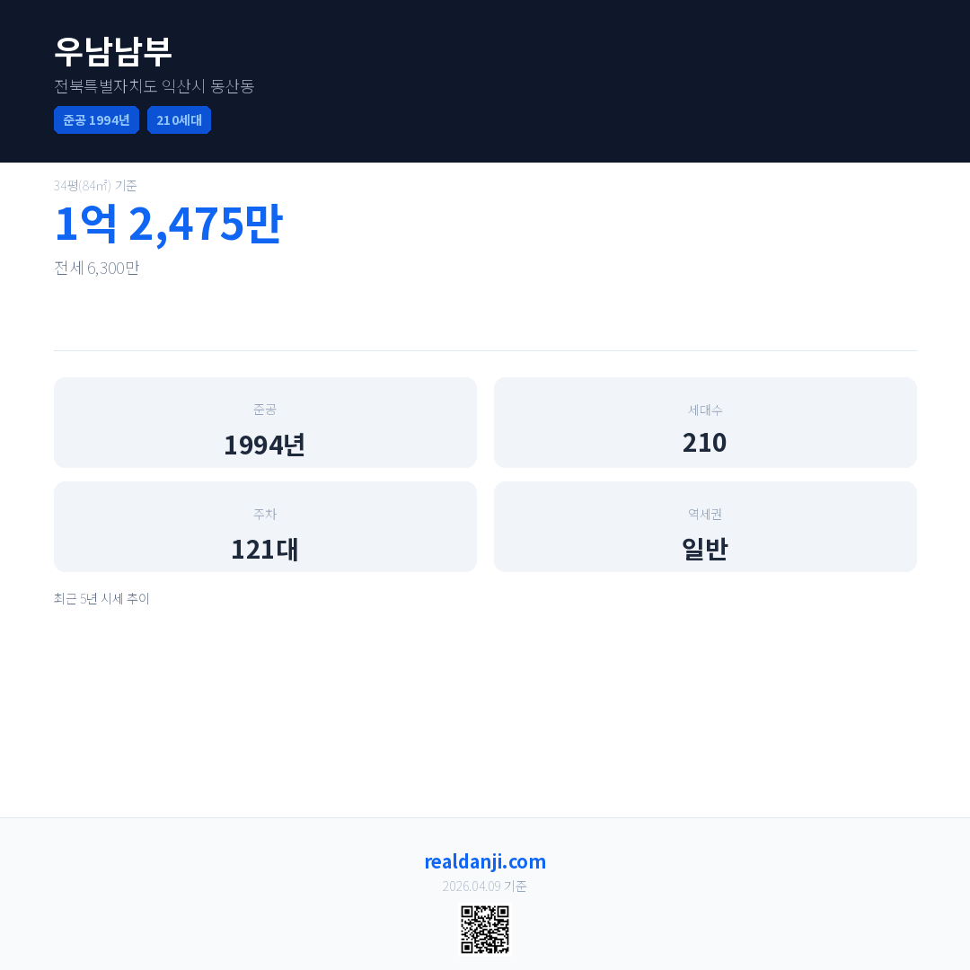 우남남부은(는) 1994년에 준공되었으며, 현재 32년차입니다. 총 210세대 규모입니다.