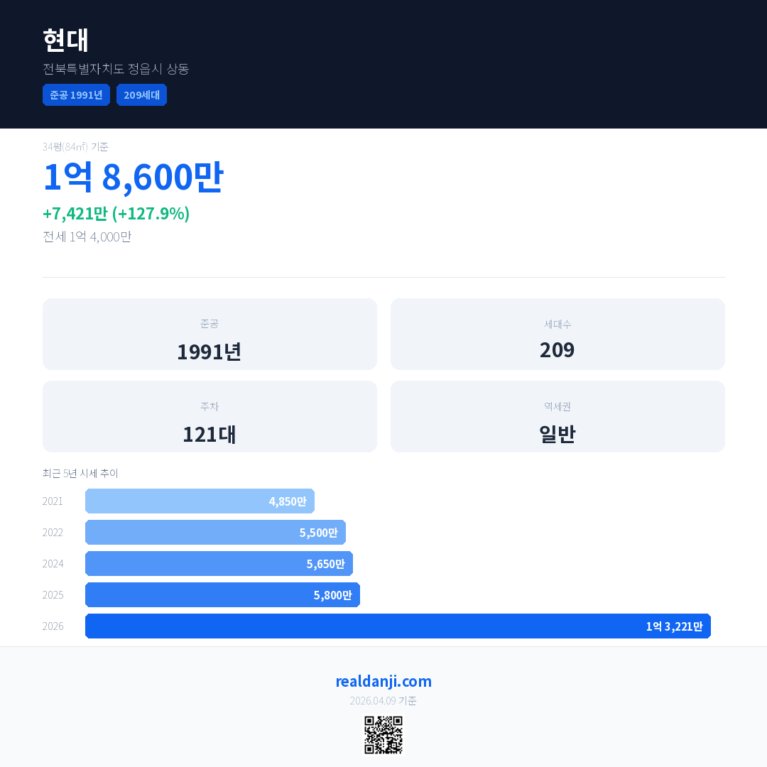 현대 국민평형 기준 2026년 평균 거래가는 1억 3,221만으로, 전년 대비 127.9% 상승 했습니다.